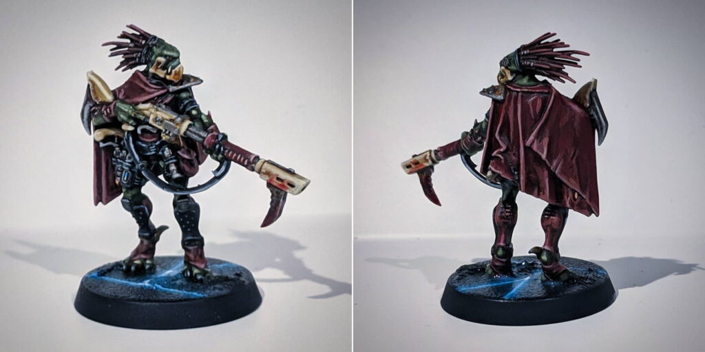 Returning to the present (and reality), Dahyak himself was a really fun and surprisingly speedy miniature to paint – the vast majority of textures and colours on this miniature I had already employed elsewhere. His cloak (and quills) were painted in the same fashion as Pious Vorne’s skirt, while his studded shin guards were identical to Vorne’s armour. Other than a couple of minor details, the only real areas of distinction were his skin and rifle. For the rifle, I basecoated the wooden areas in Elfic Flesh and shaded with Seraphim Sepia, before bringing back up the edges in Elfic Flesh and picking out corners with White. His reptilian skin I did using Vallejo Heavy Grey (a surprisingly greenish colour), highlighted with Camoflague Green and Elfic Flesh, then washed with Athonian Camoshade. Dead simple, dead quick.