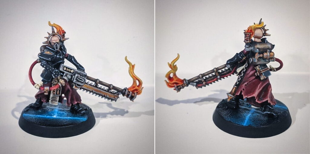 Pious Vorne is an ex-hive ganger turned Missionary, whom Taddeus the Purifier has turned to the light of the Emperor. There’s not really much more out there for this character other than a healthy love of immolation (yet), but honestly, that’s all I needed. Suddenly, so much about the miniature makes sense. There’s a sense of duality to Vorne’s design – the brazier-influenced metalwork of the flamethrower vs the menacing studded leather armour. The brass halo across her head vs the creepy Bane style rebreather. The Ecclesiarchy needs no assistance getting grimdark on it’s own terms, but the added element of a sketchy past just really adds to the vibe of this mini. What was once a fanatical chainsaw-flamethrower wielding servant of the Emperor, suddenly feels that much richer, that much more sinister and yet.. that much more human.