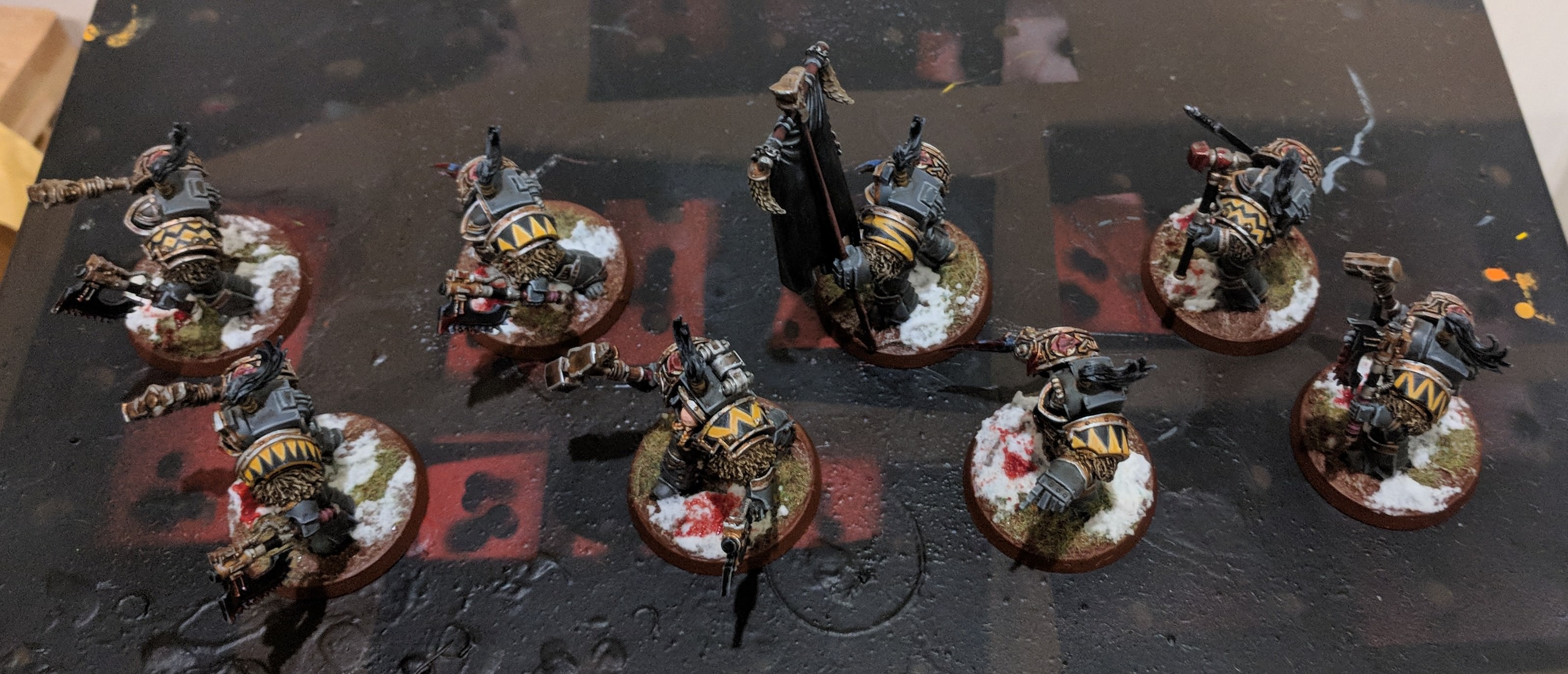 The rest of the Varagyr were a fairly standard affair for my VI Legion, with frost weapons being given a couple blue glazes over their edges to differentiate them a little from standard power weapons. The ‘Wolf Standard’ in the unit was given a fairly basic and unambitious paint job, with my first attempt at freehanding ‘stars’. I dunno, I might return to the standard sometime to try and improve upon the design with some different, faintly coloured nebulas, but I’m happy with the effect from arms length. It’s a Wolf head, it’s a space background. Space Wolves. Yep.