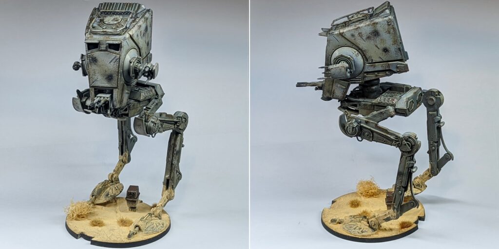I shouldn’t have been so surprised. This approach to basing has worked well for models like Stormtroopers, Speeder Bikes and even Dewbacks, but there’s a lot of empty space on the AT-ST’s base. I felt like it just needed a little something extra. Figuring it could use a little something Star Warsy on the base, I decided to use a 3D printed Gonk Droid that I managed to find on eBay for a couple quid. The Droid received a quick and simple paint job job – a brown chassis with silver legs, followed by a drybrush and some sponge weathering. As one final little touch to the base, I pulled apart a dry, natural loofah and rolled the mesh up into a ball – a very quick and easy way to make tumbleweeds. You could airbrush this if you like, but I thought the natural colour was close enough, so I gave it a light dusting with my ochre pigment powder and called it a day.