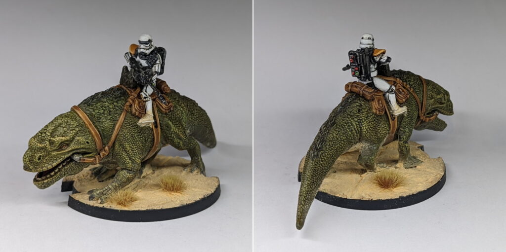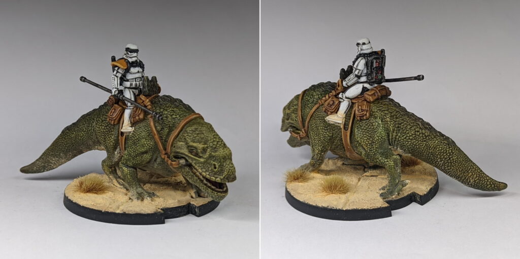 The Stormtrooper rider was pretty unremarkable by comparison. I painted him the exact same way that I’d painted any Squad Leader Stormtrooper before him. The only thing of note I’d like to point out is that the kit comes with four weapon options – and you can assemble two of these on separate torsos and swap them out as you like in game. I opted for the loadouts that I thought looked the coolest – the no upgrade shock prod and the big gun – and I will say it’s kind of cool that the peg design of the mini means you can swap out the torsos without having to install any magnets or anything. Still, there’s two more weapon options that I couldn’t build from the kit – and I’m honestly quite happy to have a reason to build and paint a 2nd one of these down the line.