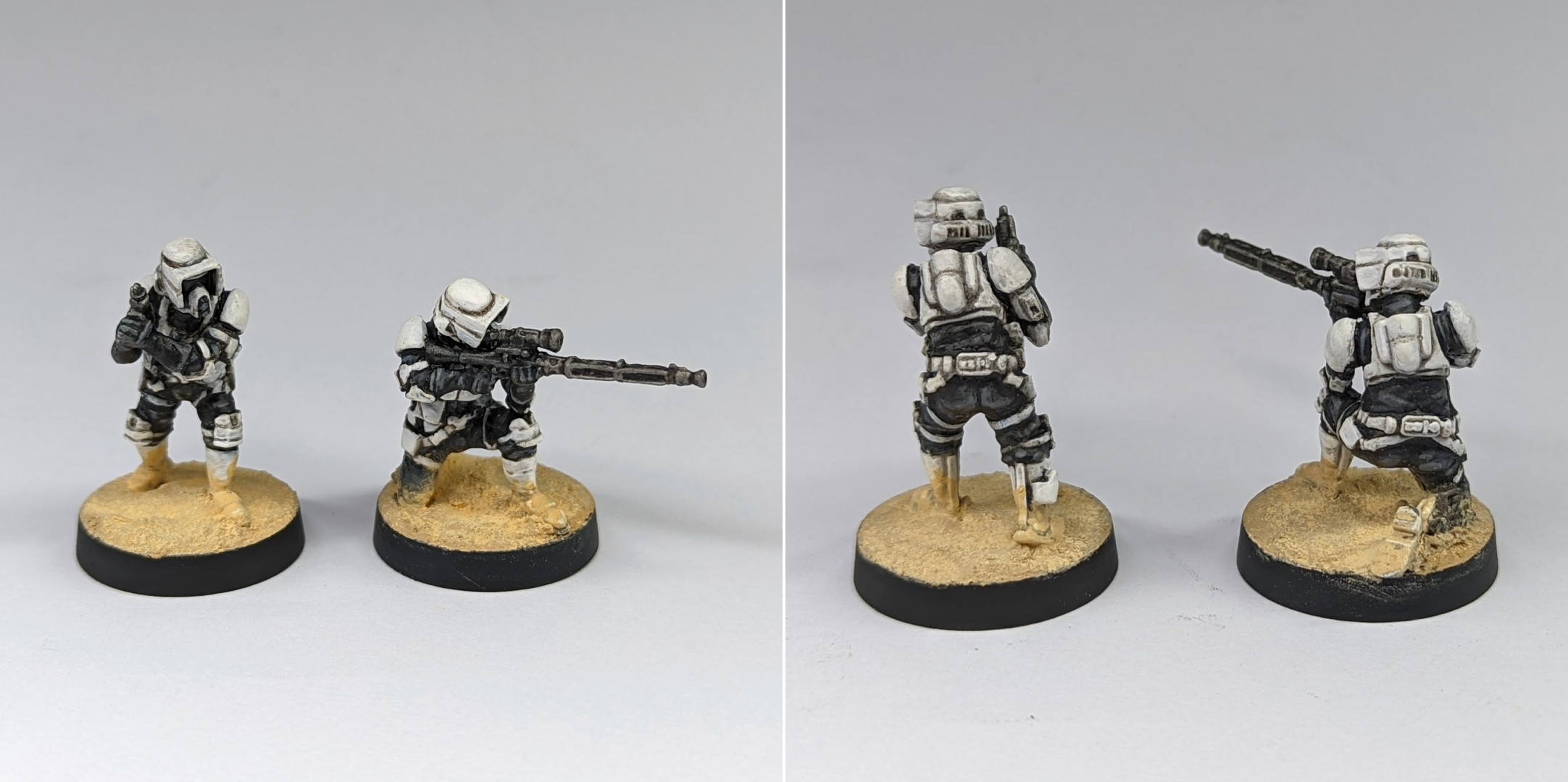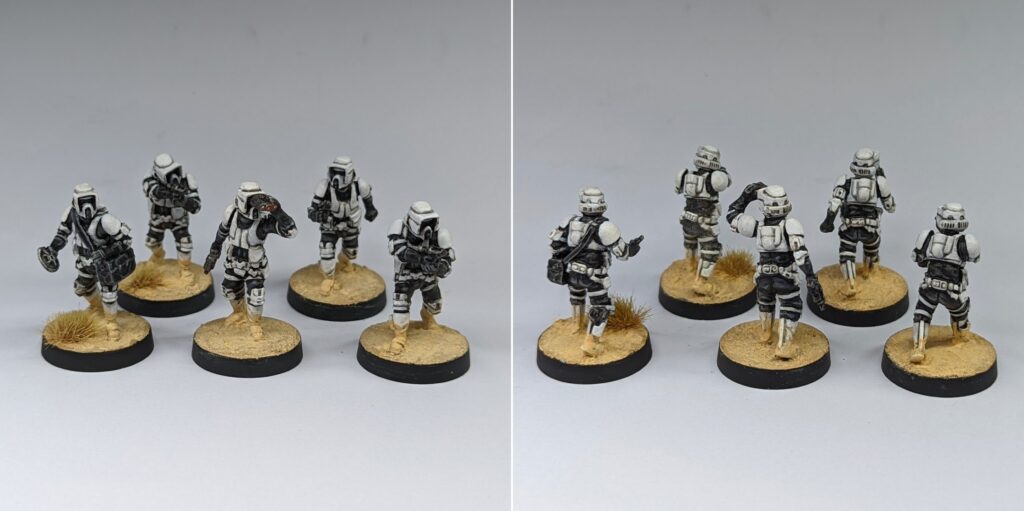 That being said, I of course couldn’t resist just painting up the rest of the box, could I? It seemed a bit wasteful to paint just two of the Scout Troopers from a box of seven, particularly when the kit so graciously comes with two unit cards for fielding both types of squad. The day may yet come where I cut that corner, but it is not this day1!