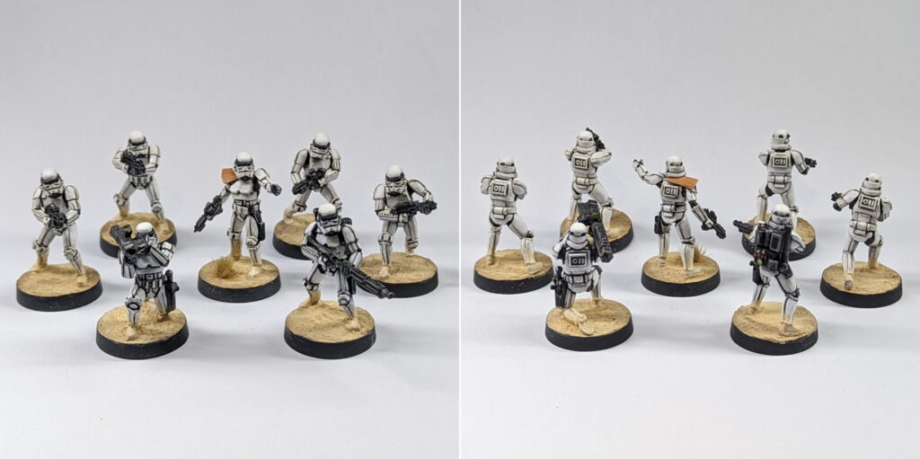 Nothing flashy here, no upgrade expansions or anything like that yet. Just another bog standard squad of Stormtroopers. Aside from Mercenaries, Galactic Empire have three distinct options for their Corps – Stormtroopers, Snowtroopers and Shore Troopers. Maybe I’m just being obtuse but I feel like I need to rule Snowtroopers out on the basis that they might look a little weird on my desert basing scheme. Shoretroopers, on the other hand, would look right at home – but ehhhhh, I dunno, I’m not entirely sold on how they look just yet. Variation is nice, but I feel like you can’t go too far wrong with three units of classic Stormtroopers. I still quite like painting these, as they’re fairly low stress and quick to knock out a squad.