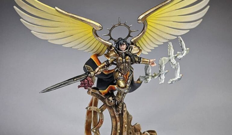 It has always been my intention that my Sororitas army, on the whole, would not look conventionally beautiful. I wanted them to look grimy, gritty and worn out from a millennia of standing against the worst witchcraft, heresy and mutation that the galaxy has set against the Imperium. My colour scheme is intended to represent the dying light from a flickering wax candle – something ancient and reverent, yet flagging and somewhat diminished. For Celestine however, arguably the centrepiece of my army, I wanted the exact opposite. I wanted the Living Saint to look pristine and resplendent, a shining beacon of the Emperor’s light. Taking some advice from hobby legend Barrie Watkins – a man who really knows how to paint gold – I refrained from my usual catch all approach of taking the finished miniature outside to spray with Dullcote on this one. Instead, I very carefully applied brush on matte varnish to the wings, face and tabards and gloss varnish to all of the metallics. This meant that – unlike the rest of the army – the natural reflectiveness of the metallic paint was allowed to shine through instead of getting choked out by the matte varnish, helping further stand Celestine apart from her peers. As ever, once the varnish was down, I applied a little Water Texture to the base and Celestine was finished.